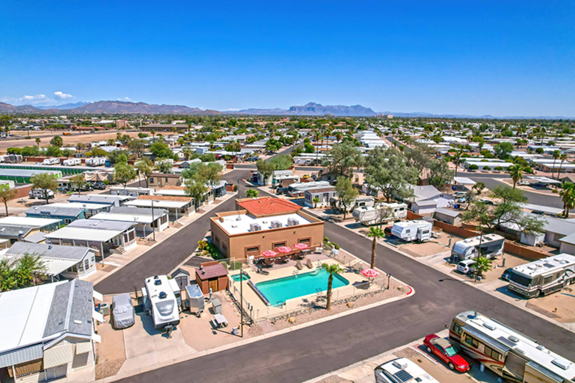 Welcome to Desert Vista RV Resort in beautiful Mesa, Arizona! Nestled in the heart of the desert, our tranquil and inviting 55+ adult community is the perfect haven for both short and long-term stays. At Desert Vista, you'll find spacious, well-designed sites that offer the privacy you crave, along with the warmth of a friendly neighborhood. Whether you're looking to fill your days with engaging activities or simply unwind, we have everything you need—from a large, welcoming clubhouse to a sparkling, heated pool. Our prime location near Phoenix means you’re just a short drive away from world-class sports complexes, breathtaking outdoor recreation, and rich cultural attractions. As the sun sets over the desert and the mountains come alive with color, you'll know you've found your perfect RV getaway. With our stunning scenery, mountain views, and those unforgettable Arizona sunsets, Desert Vista RV Resort is more than just a destination—it's a place you'll love to call home.